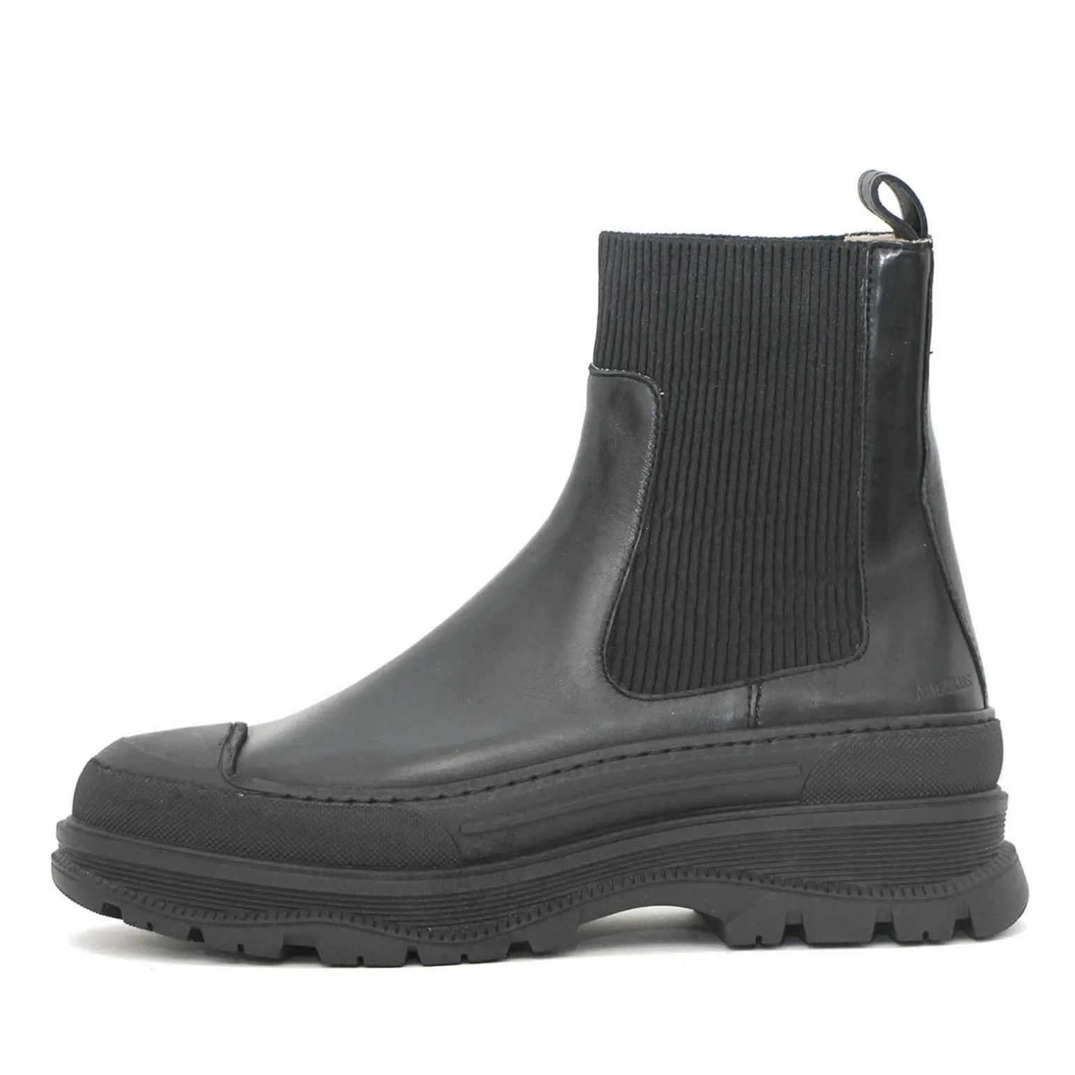 Elastik støvle sort med sort chunky sål. Støvlen er i lækker skindkvalitet og skindforet. Dekorativ pyntestrop bagpå. Størrelsen er normal er du mellem 2 numre skal du vælge den største.
