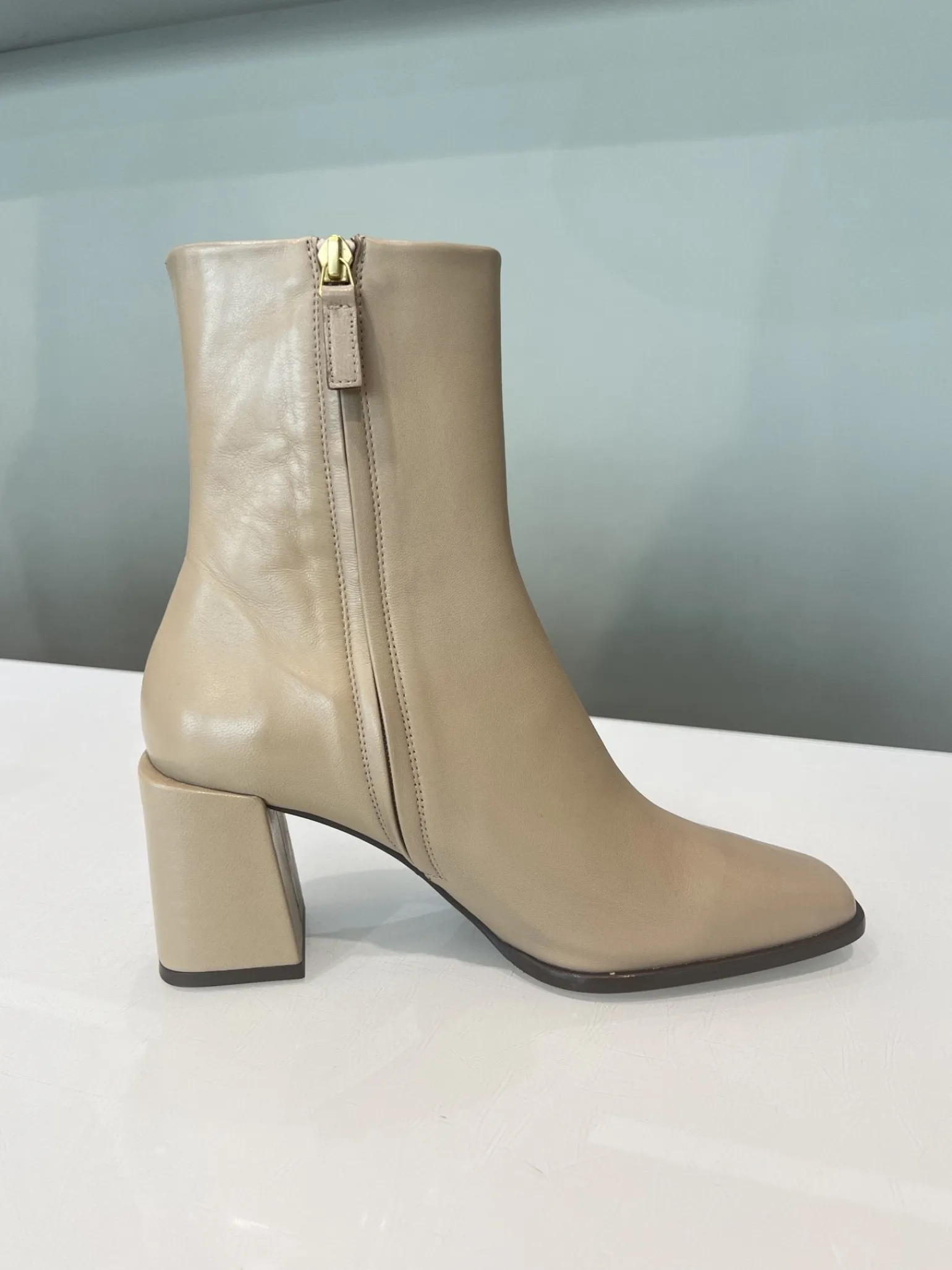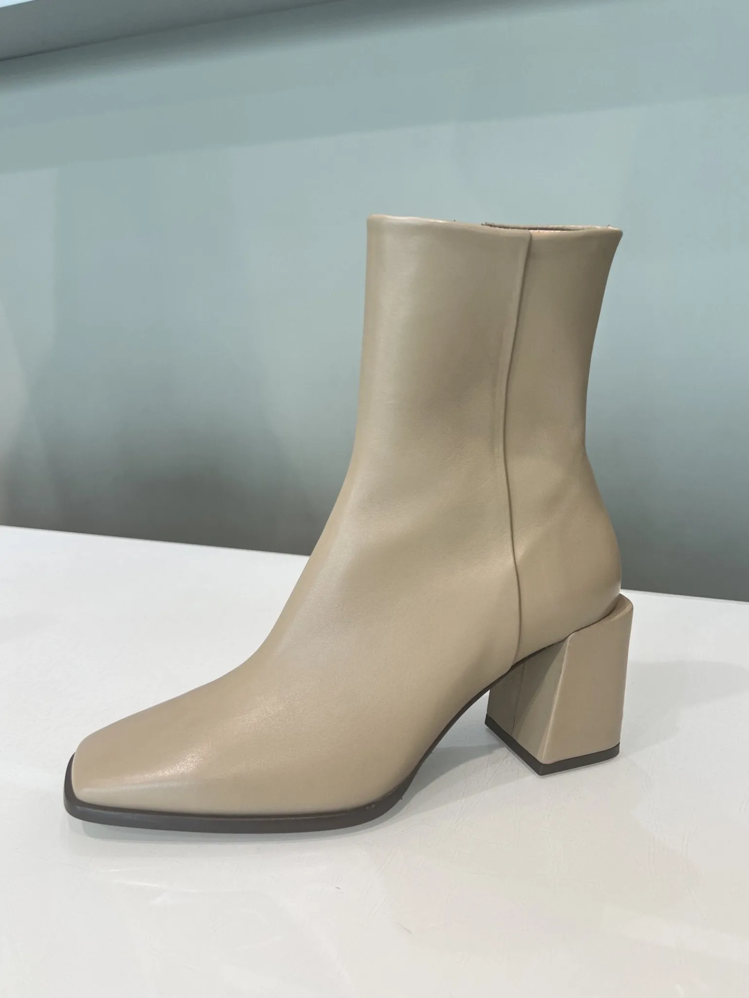 Elegant hælstøvle i det blødeste, glatte skind. Støvlen har trendy firkantede snuder samt oversized, chunky hæle. Med lynlås på indersiden er støvlen lige til at smutte i, ligesom den med sin 7 cm hælhøjde er behagelig og nem at gå i. Fås også i sort.