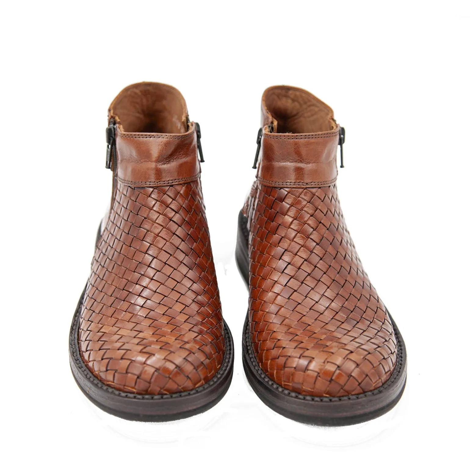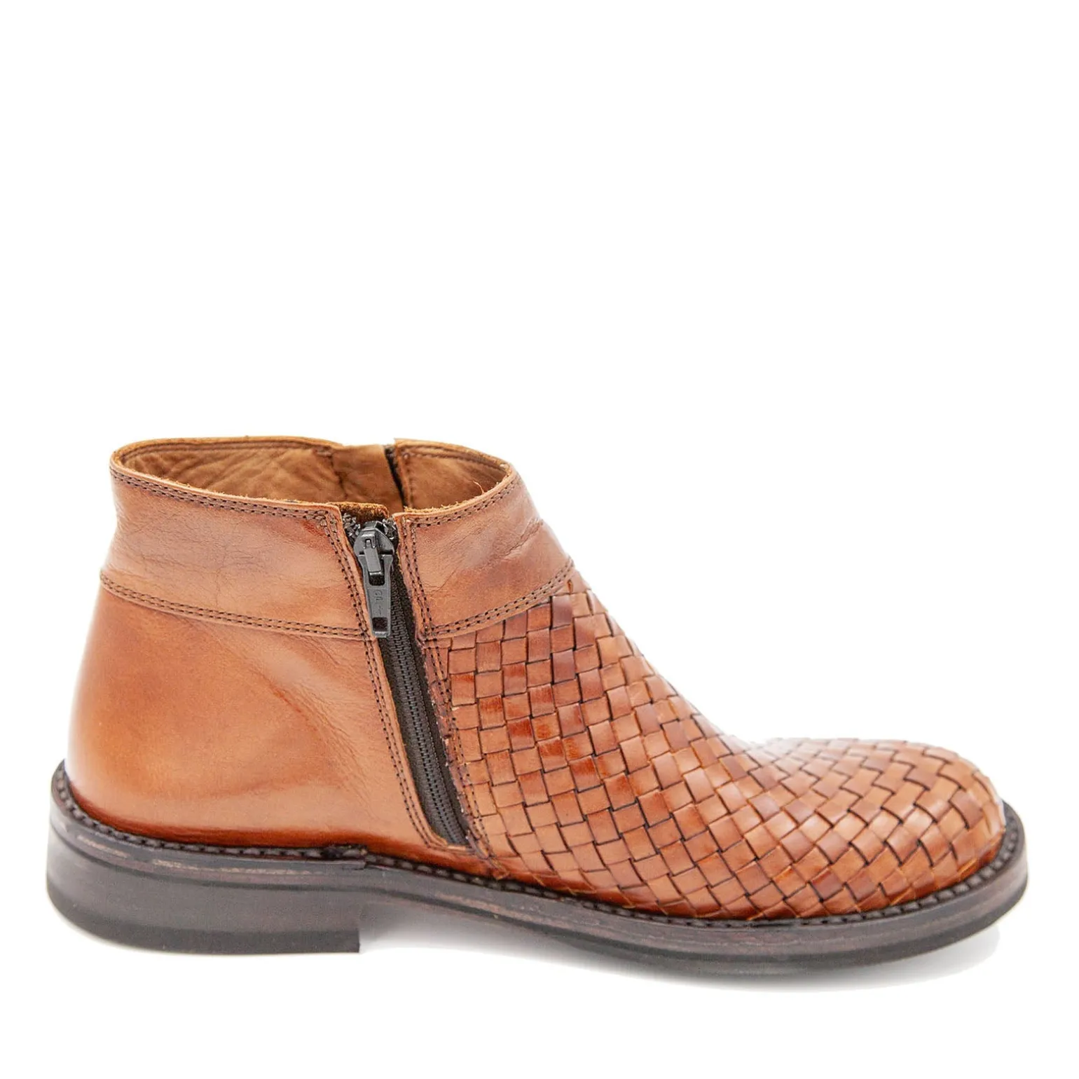 En klassiske! Kort, cognacfarvet støvle lavet i vegetabilsk garvet skind. Støvlen har flet fortil og dobbelt lynlås samt lædersål betrukket med sort gummi.