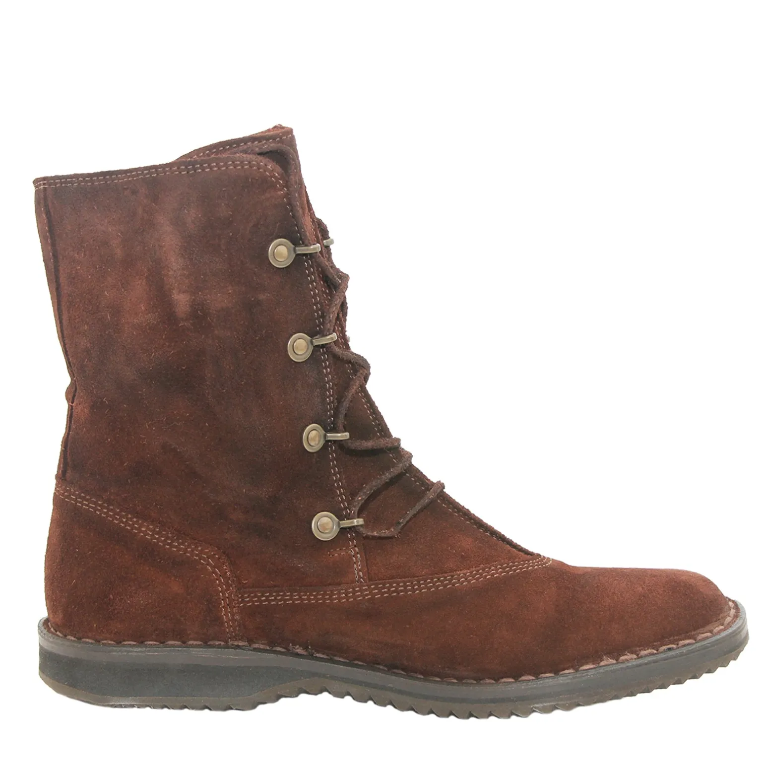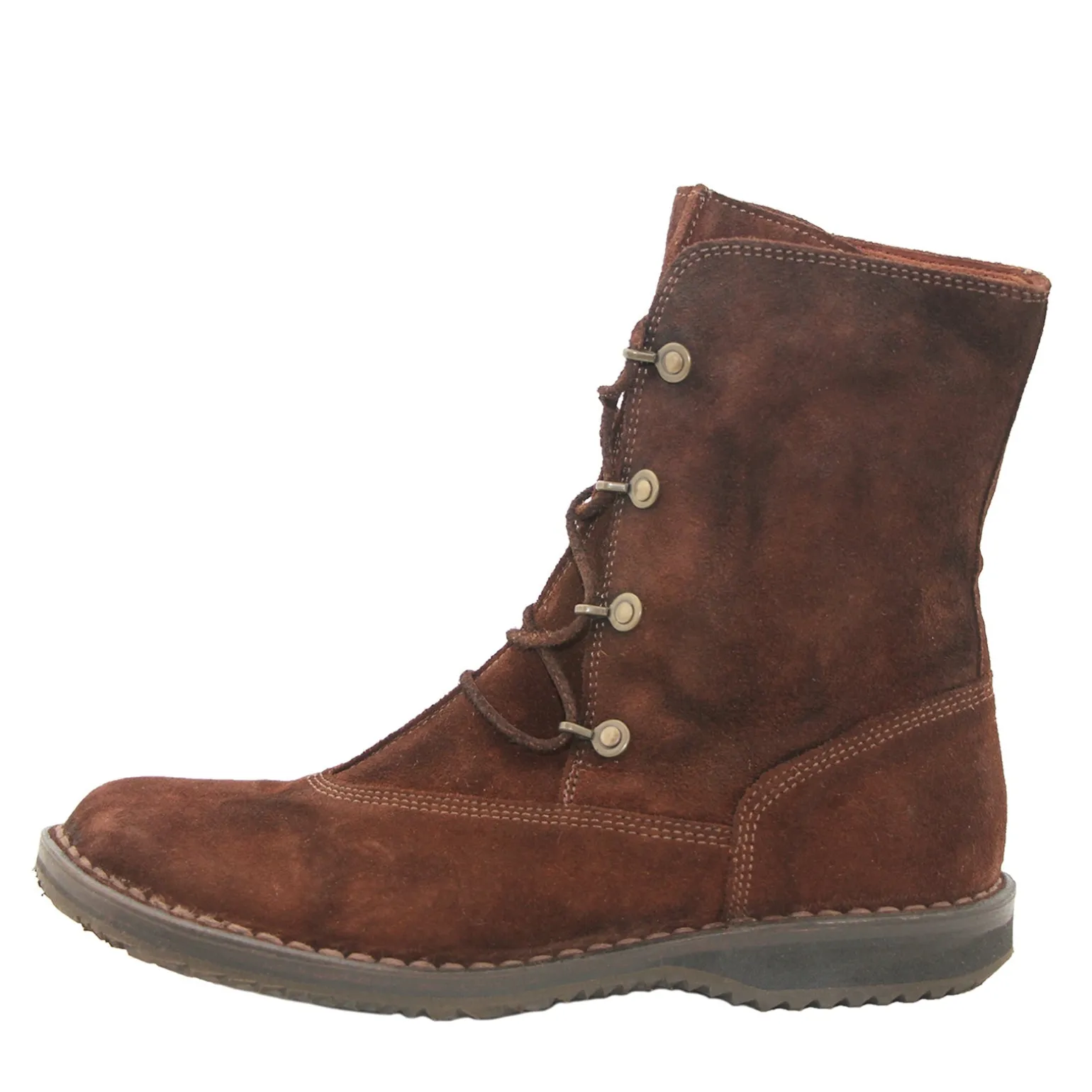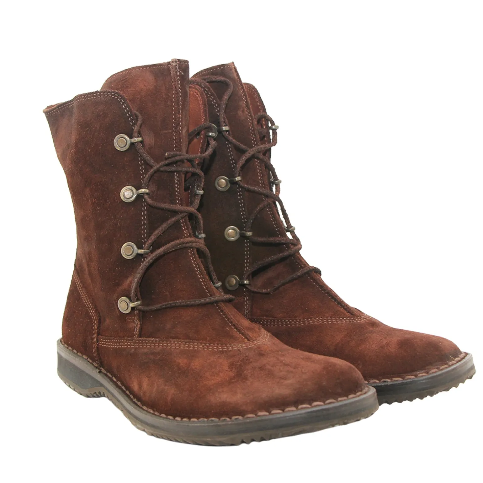 Lækker snørestøvle i en flot kastanje brun lavet i blødt, vegetabilsk garvet ruskind med mørke gummisåler. Støvlen har højt skaft og bindes med ruskindssnøre. Fodformet pasform. Stor i størrelsen.