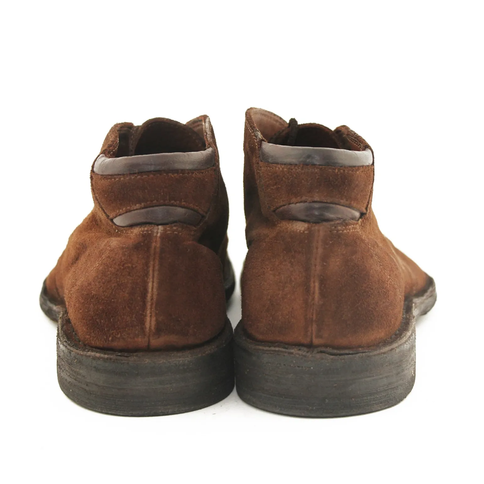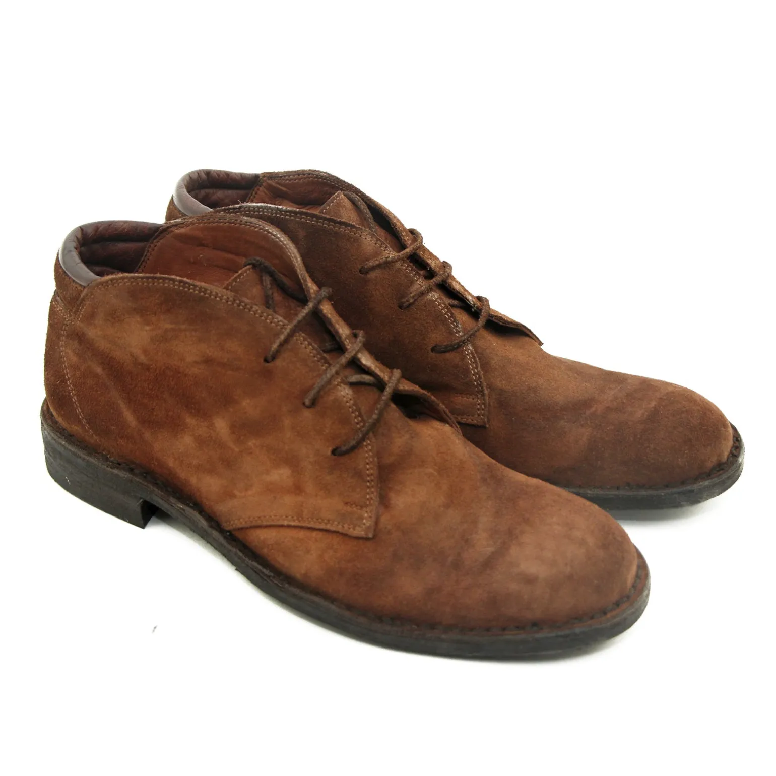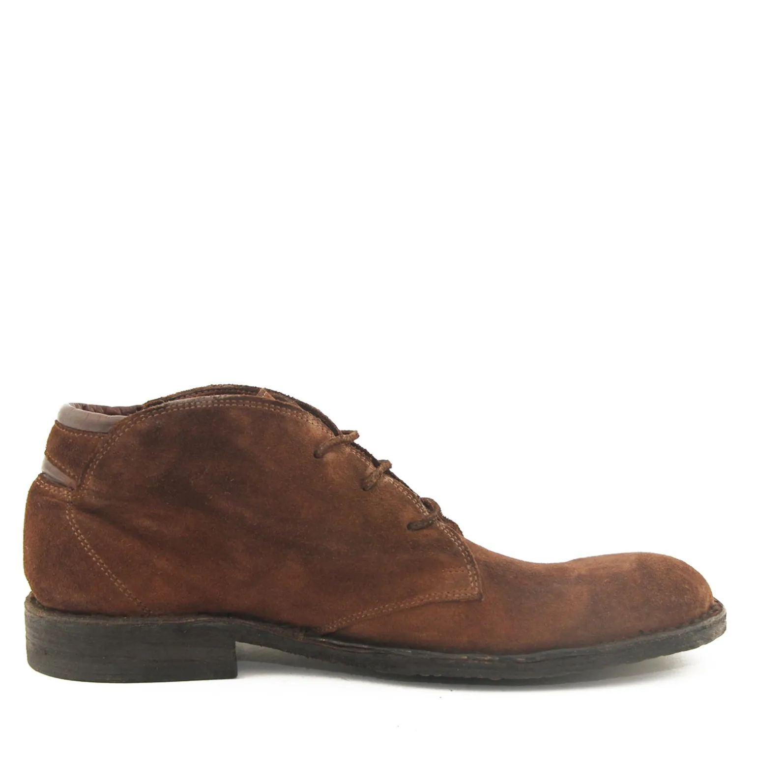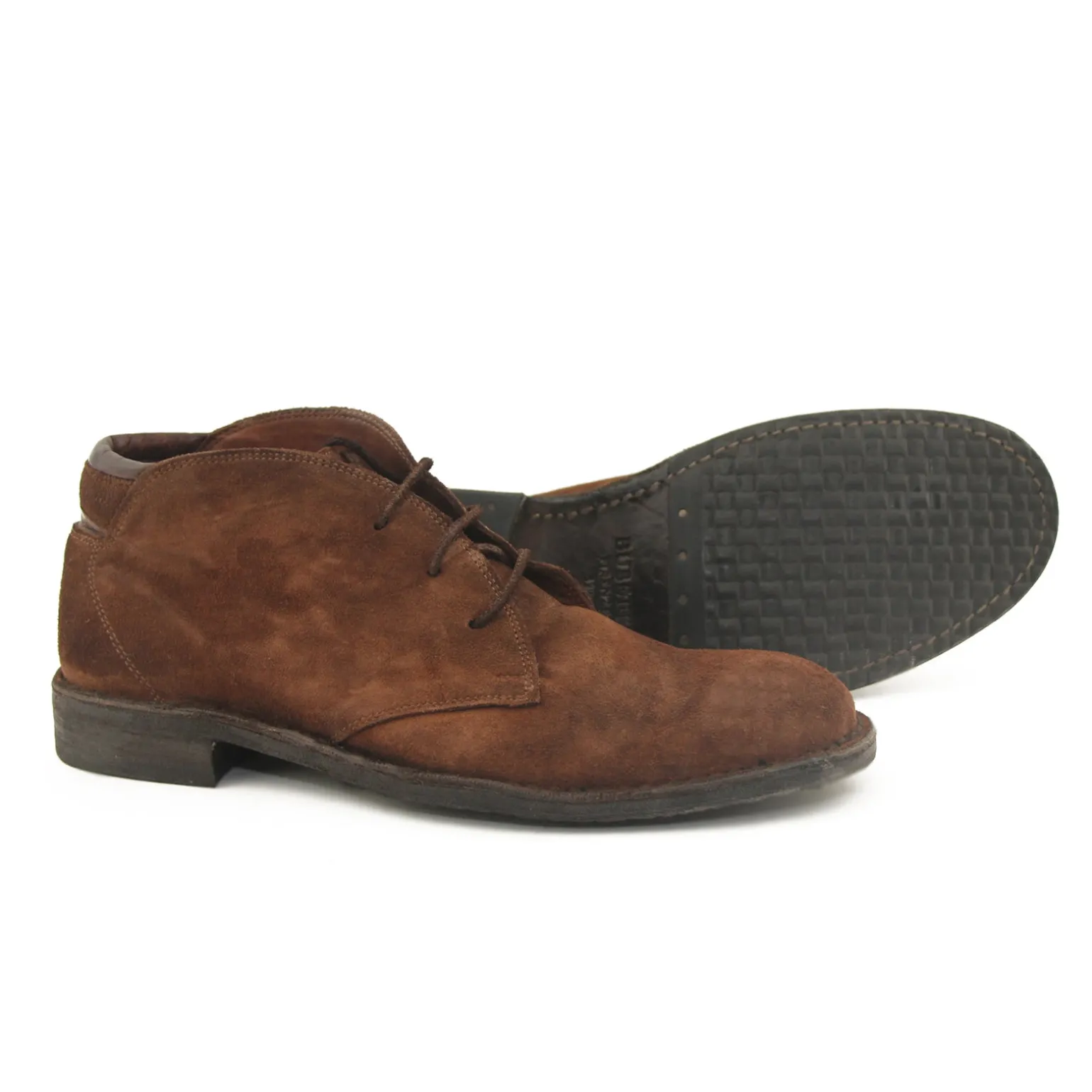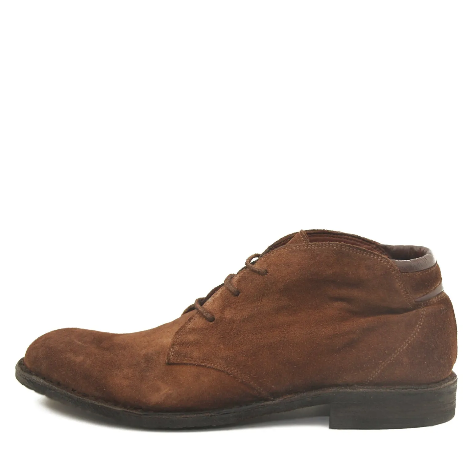 Kort herre snørestøvle i kastanjebrun ruskind med dekorative skinddetaljer bagtil. Støvlen har rund snude, tre snørehuller samt ruskindssnøre og skindsål betrukket med slidstærkt gummi.