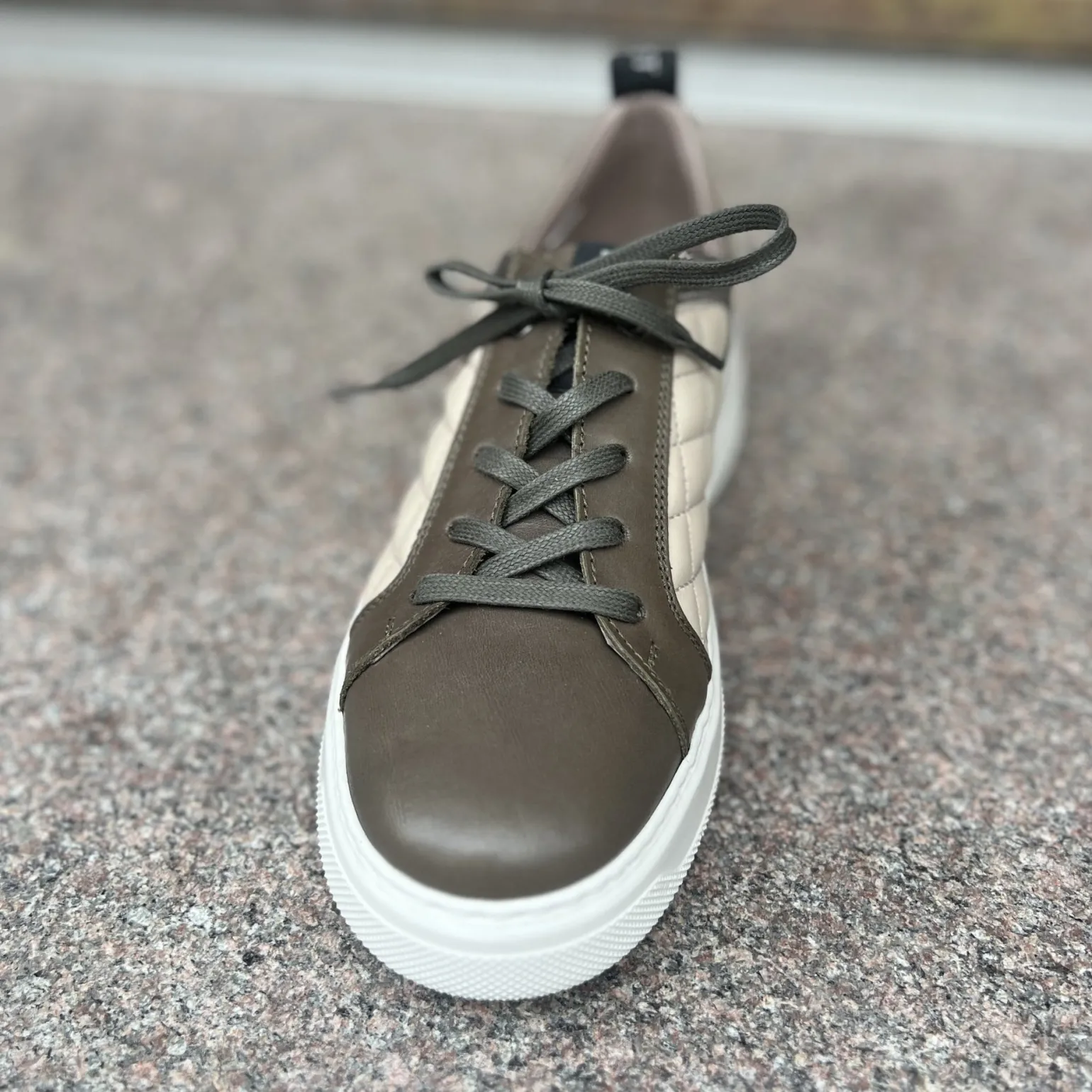 Eksklusiv og sporty dame sneaker I flot grøn-taupe, lavet i lækkert skind/nubuck. Sneakeren justeres med snørebånd. Lavet med en helt fantastisk svangstøtte og en god gummisål, der måler 3 cm.