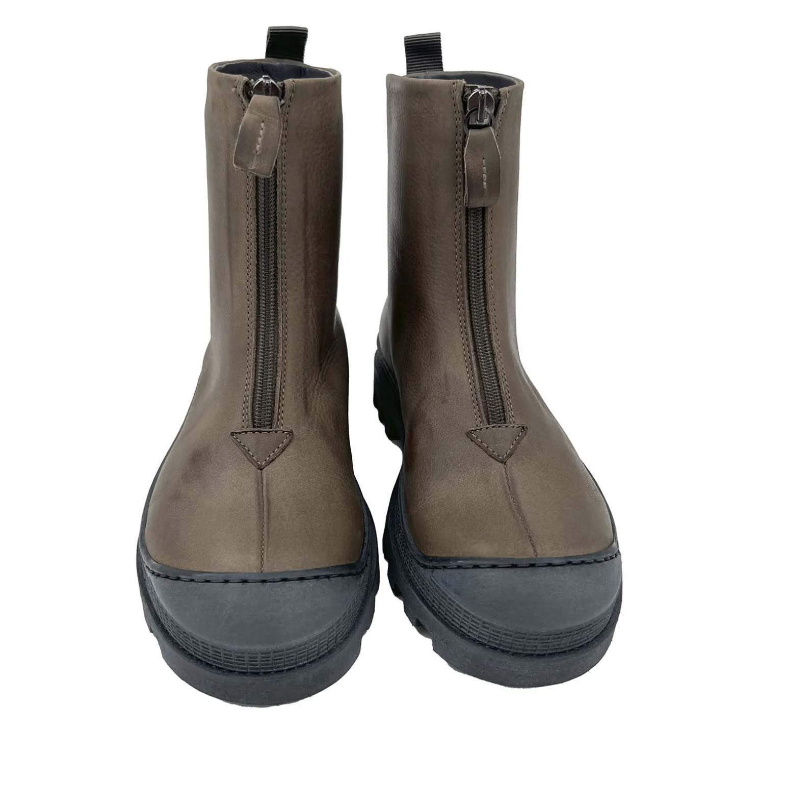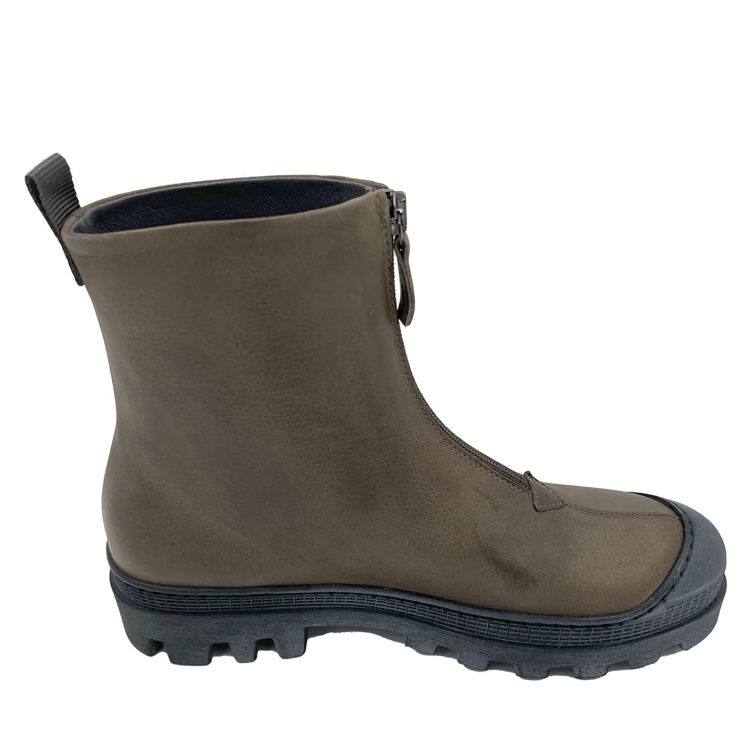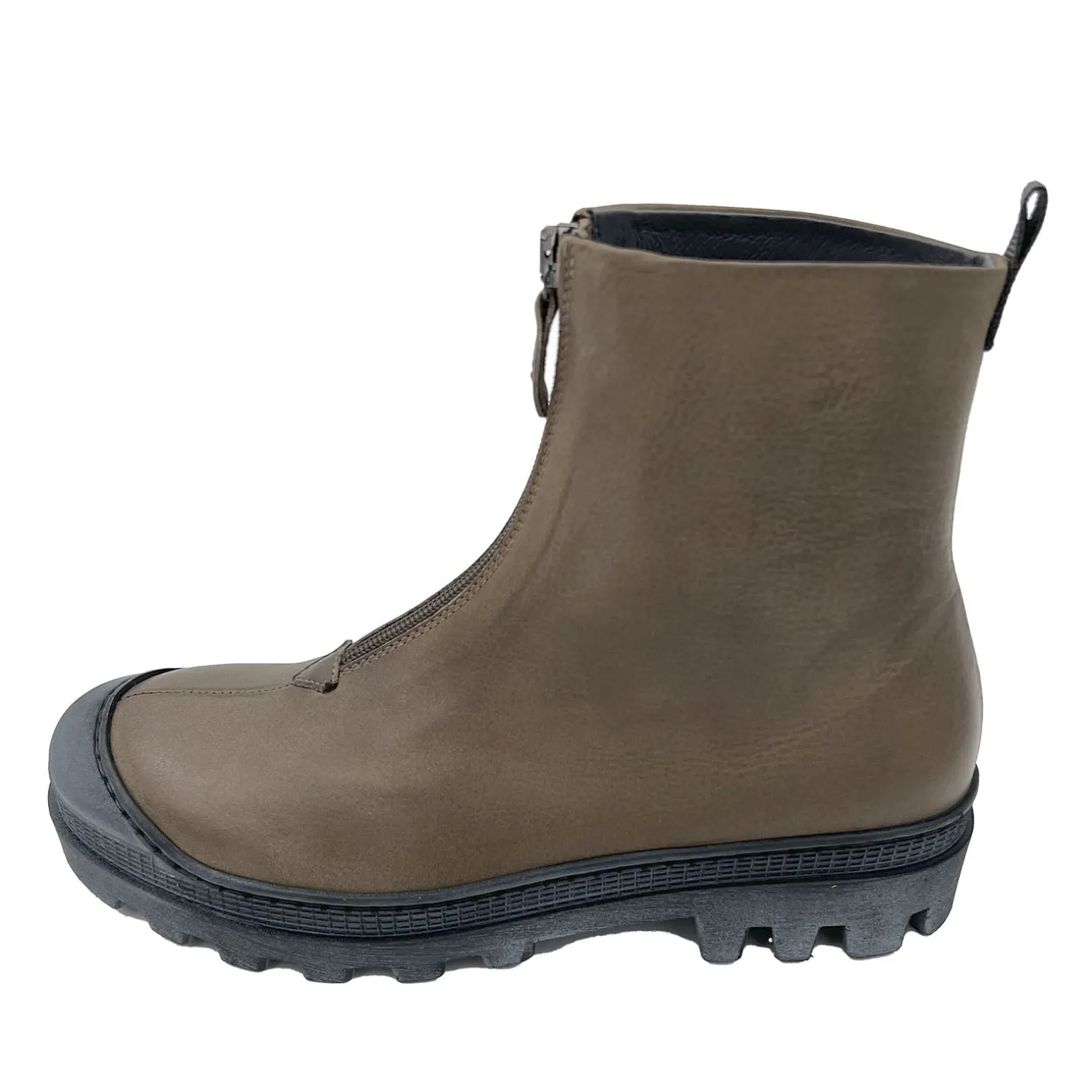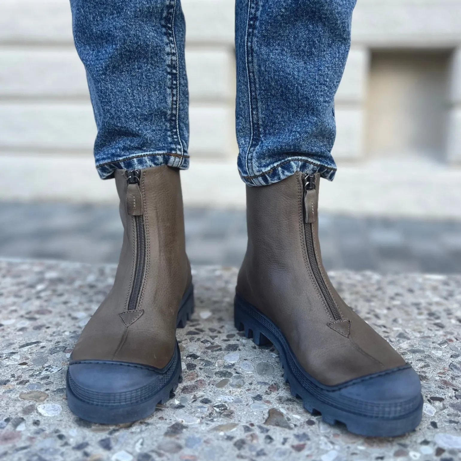 Klassisk Lofina damestøvle i oliven brun lavet i lækkert kalveskind, der har fået en olieret overfladebehandling, hvilket giver støvlen et rå look. Støvlen har lynlås ned over vristen og en pyntestrop bagtil. Stroppen er ikke til praktisk brug. Lavet på en kraftig gummisål, der er yderst slidstærk og perfekt til de lidt køligere grader.