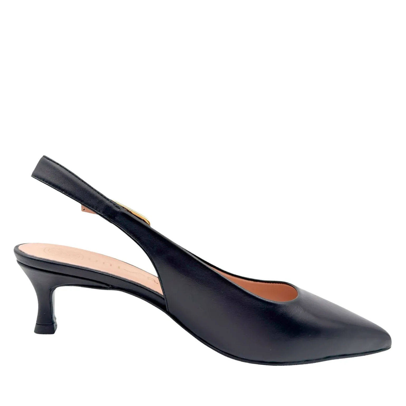 Slingback lavet I sort skind. 5 cm skind betrukken hæl. Let, flexibel non-slip gummi sål. justerbar rem med flot guldmetal spænde på siden.