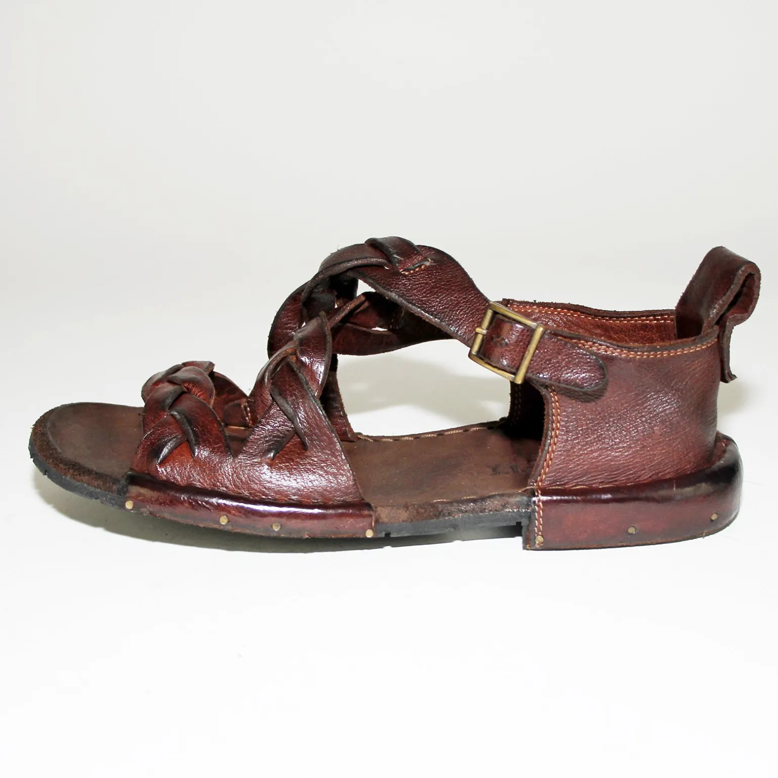 Lækker skindsandal med håndflettede remme i en flot kastanjebrun farve. Sandalens rå look er opnået ved en helt speciel vaskeproces, der tilfører skindet en smuk patina og lækker blødhed.