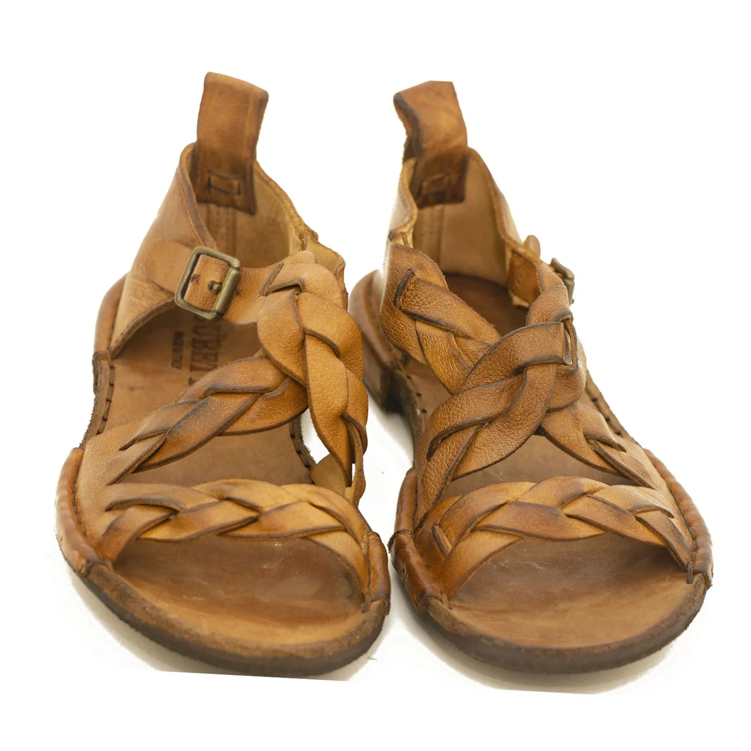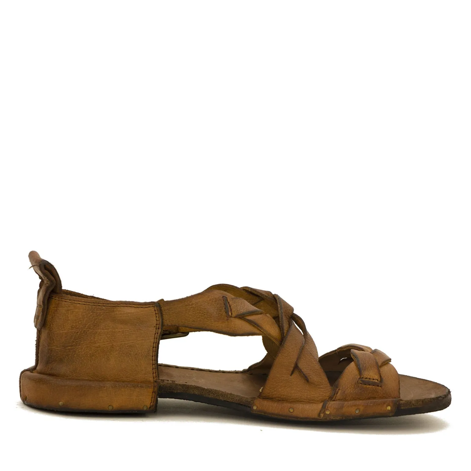 Smart, kork remsandal med krydsende remme og hælkappe, der sider godt på foden. Sandalen er lavet i blødt, vasket vegetabilsk garvet skind og åbnes/lukkes med et gammelguldfarvet spænde i siden.