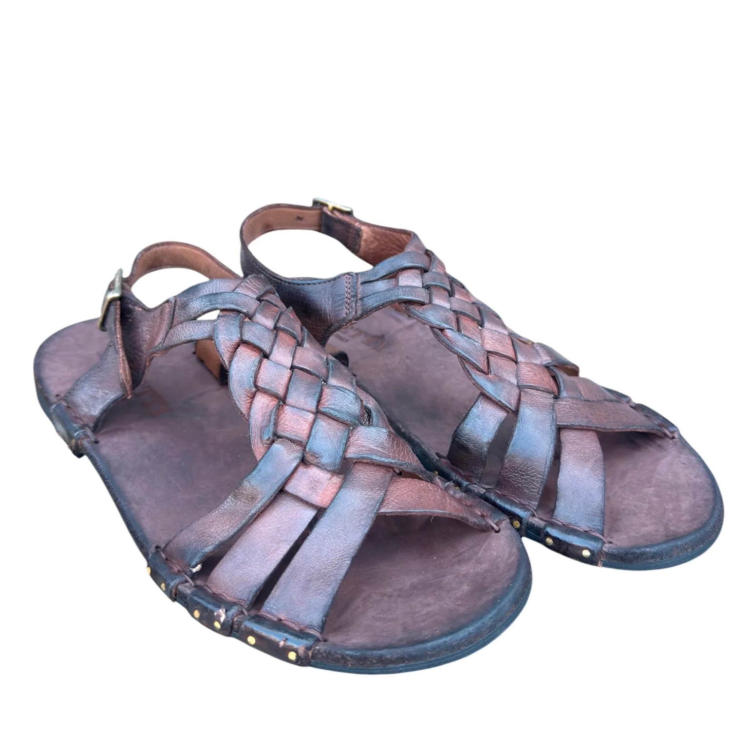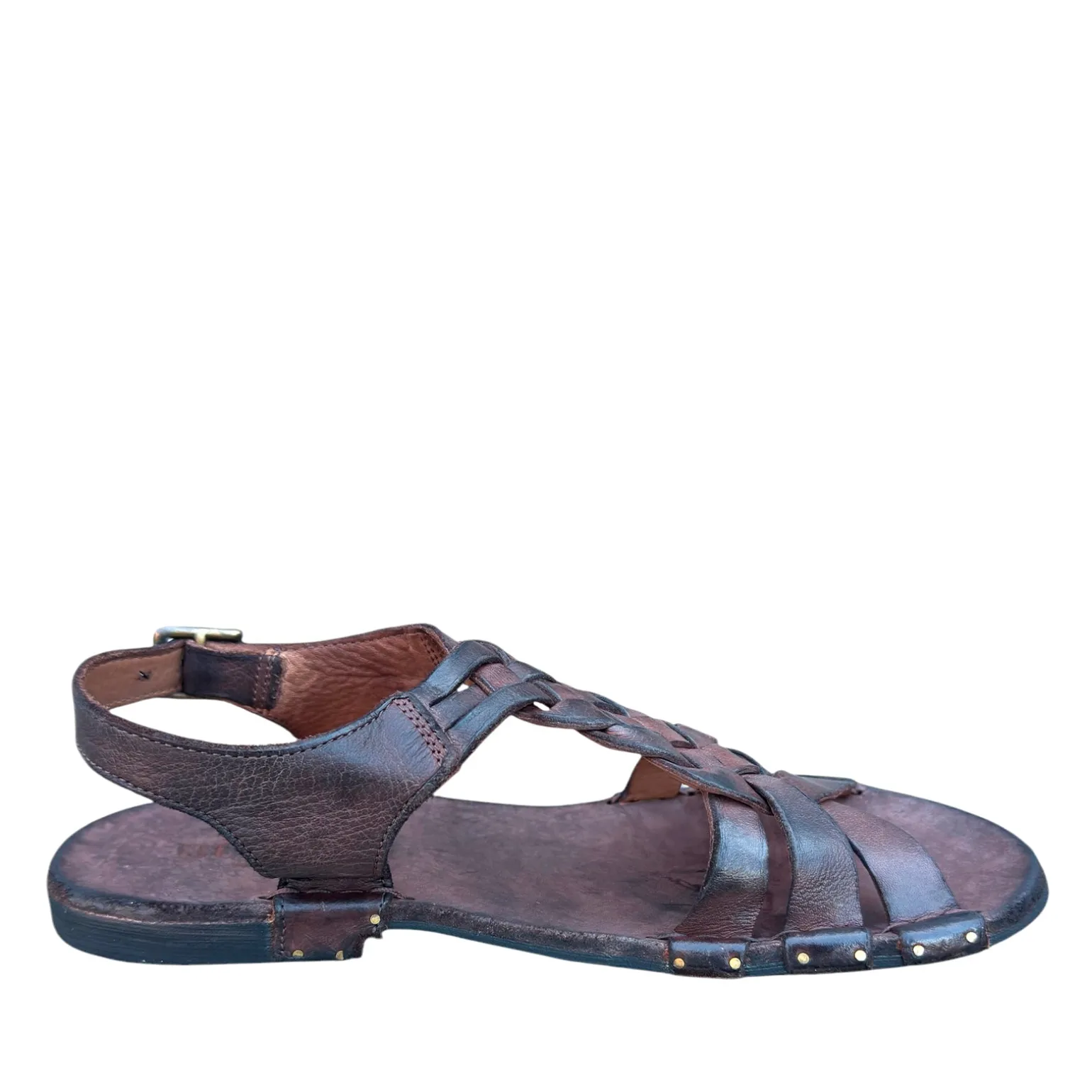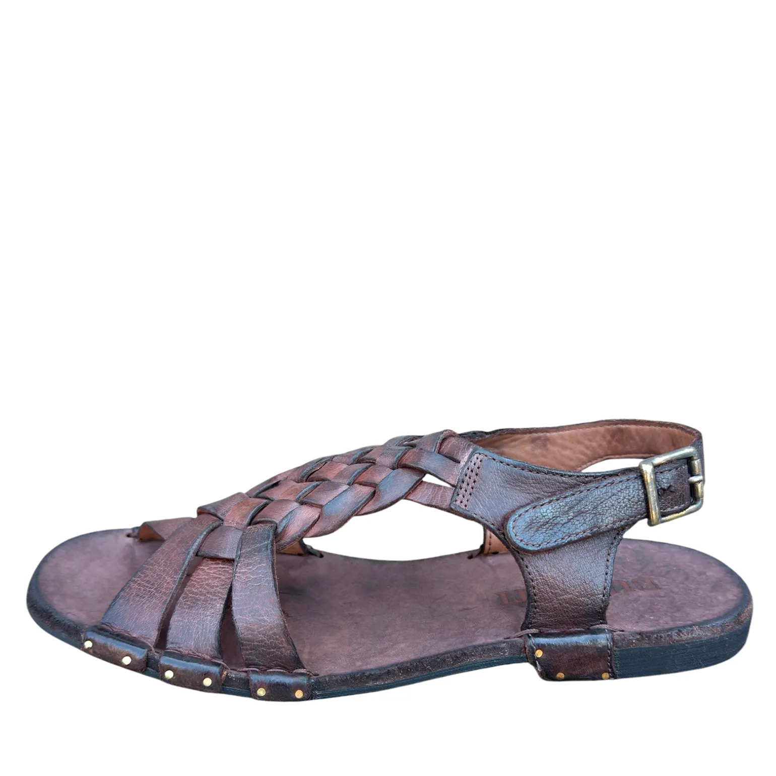 Smart hasselnød farvet rem sandal med flet lavet i blødt, vasket vegetabilsk garvet skind. Sandalen har rem bagtil og åbnes/lukkes med et lille spænde.