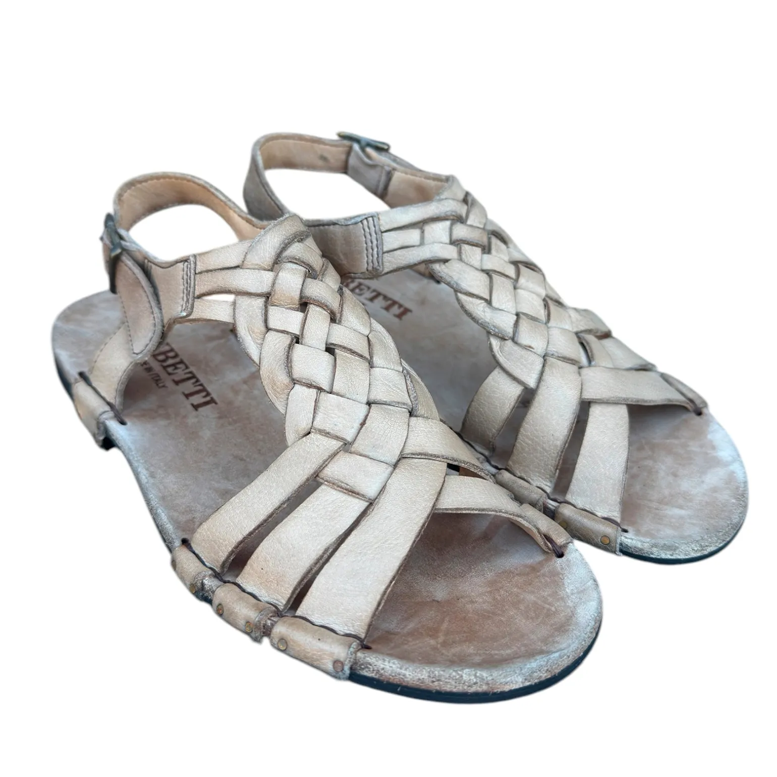 Smart taupe remsandal med flet lavet i blødt, vasket vegetabilsk garvet skind. Sandalen har rem bagtil og åbnes/lukkes med et lille spænde.