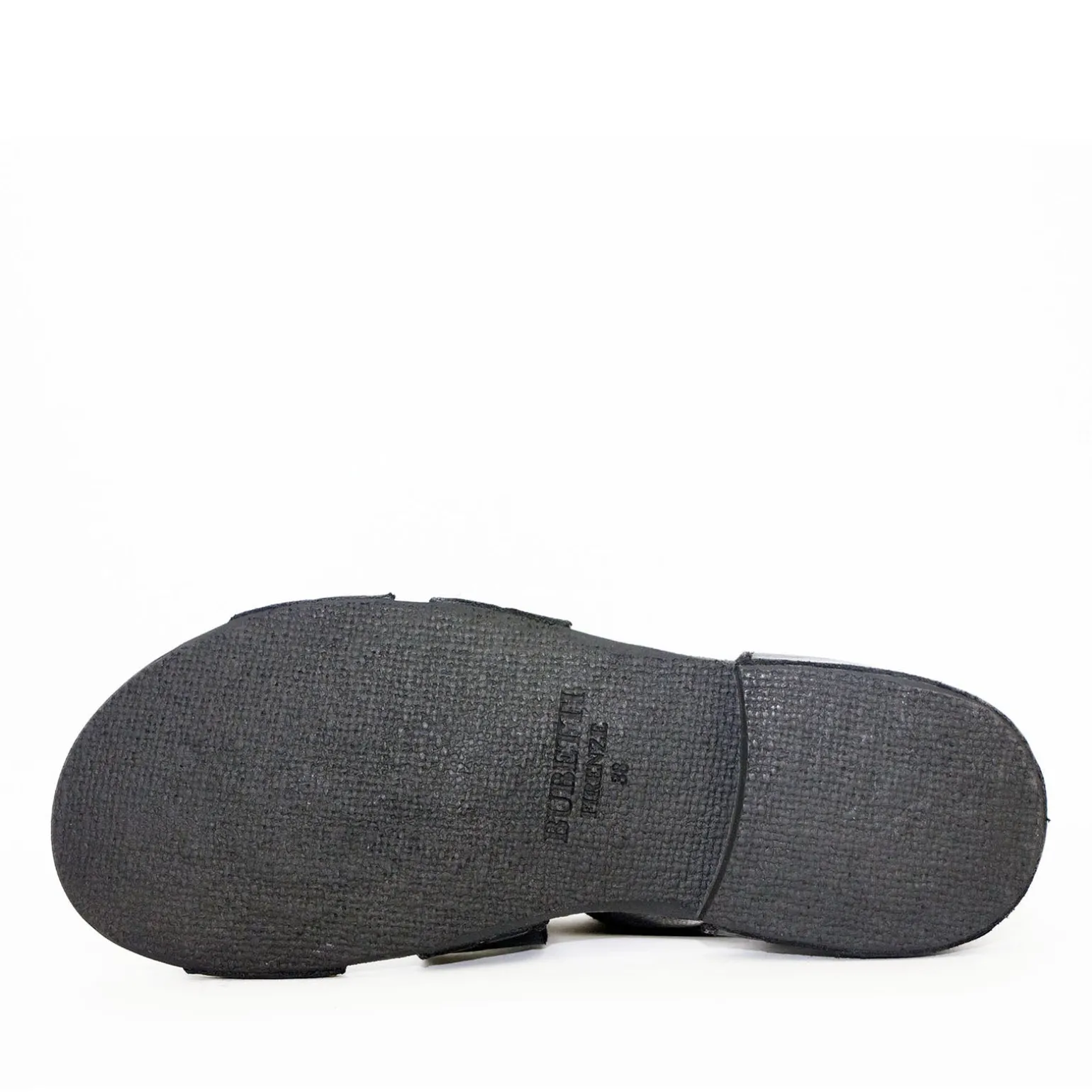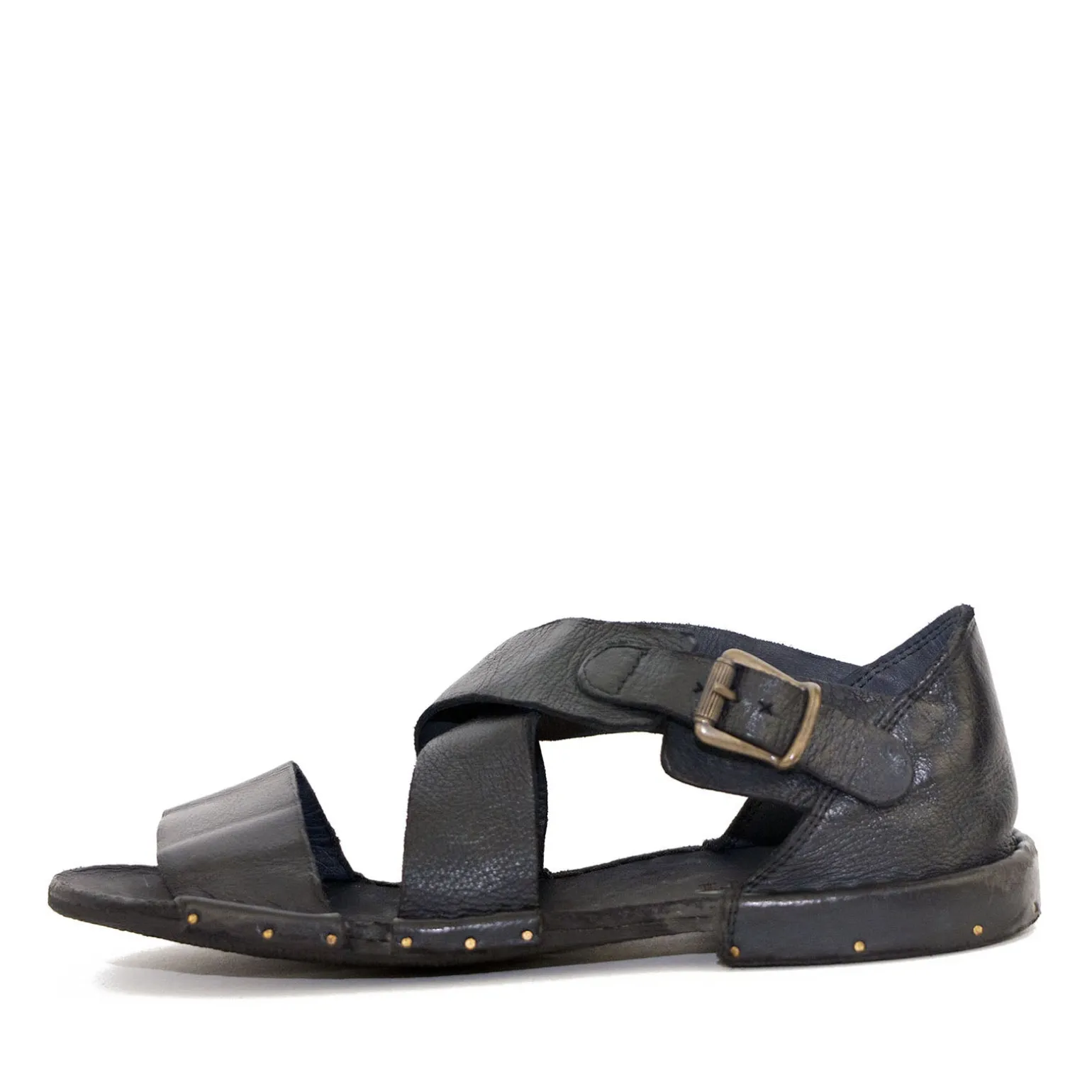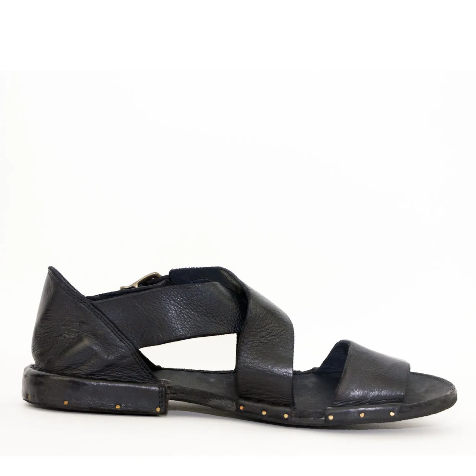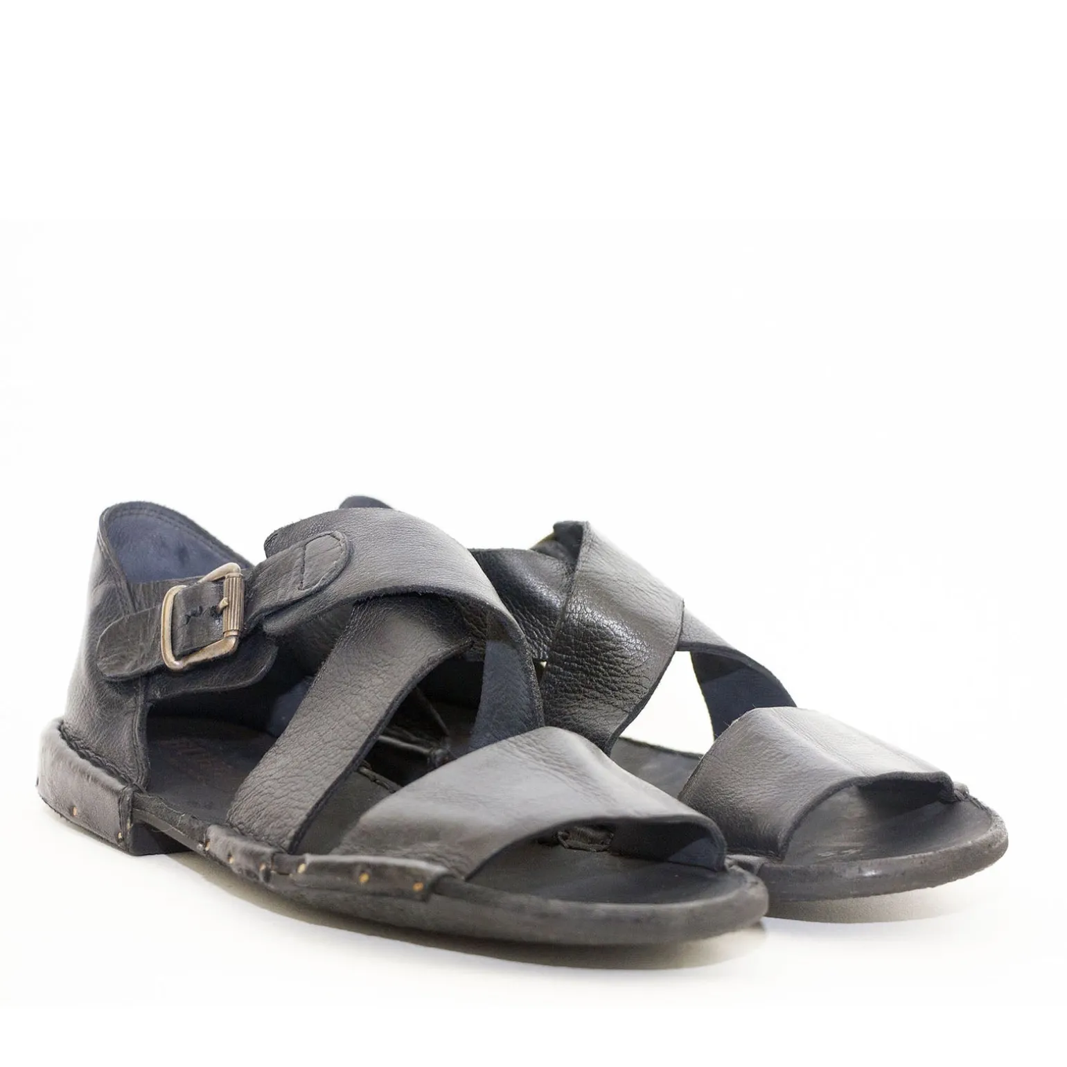 Sort remsandal lavet i vegetabilsk garvet kalveskind, der gør sandalen usædvanlig slidstærk og giver den patina fra start. Sandalen har rem med spænde og sidder smukt på foden. Lavet på skindsål betrukket med sort gummi. Skindets rå og unikke look opnås igennem en helt speciel vaskeproces – således kan hvert stykke fodtøj variere i skind og farve.